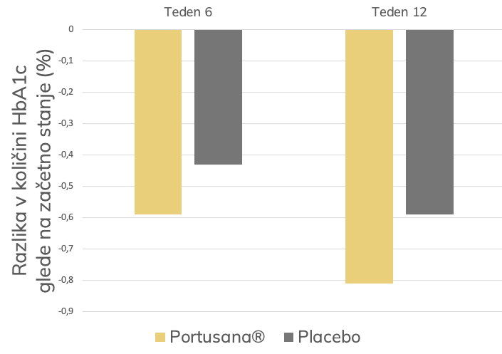 Klinična študija Portusane® je pokazala statistično pomembno znižanje HbA1c v krvi po 6-ih in 12-ih tednih.[5] HbA1c je dolgoročni marker sladkorja in glukoze v krvi.